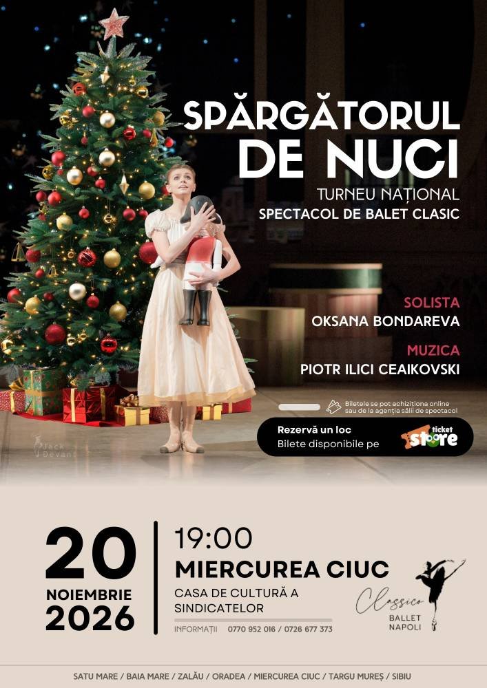 Unul dintre cele mai iubite balete din lume, Spărgătorul de nuci, revine pe scenă într-o producție spectaculoasă, plină de culoare, emoție și eleganță. Pe data de 20 noiembrie 2026, începând cu ora 19:00, la Casa de Cultură din Miercurea Ciuc, publicul este invitat să  trăiască magia iernii urmărind cel mai îndrăgit spectacol de balet al sezonului. Pe muzica inconfundabilă a lui Piotr Ilici Ceaikovski, povestea Clarei și a Prințului Spărgător prinde viață într-un univers de basm, unde dansul și imaginația se împletesc armonios.